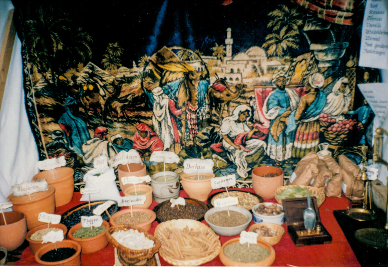Im Verbund der Morgenlandfahrer übernehmen wir die Rolle des fahrenen Gewürzhändlers. Gegründet eintausendneunhundertzweiundneunzig Jahre nach Fleischwerdung des Herrn waren wir früher mit Veranstaltern wie z.B. "Lutzelot" und "Vogelfrei" unterwegs. Nach einer mehrjährigen Pause findet man uns seit einiger Zeit auf ausgesuchten Märkten wie "Loraine Medival" aber auch auf vielen freien Märkten und Burgfesten wieder.